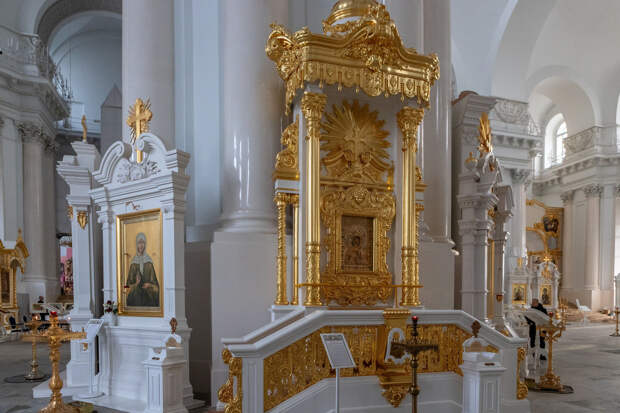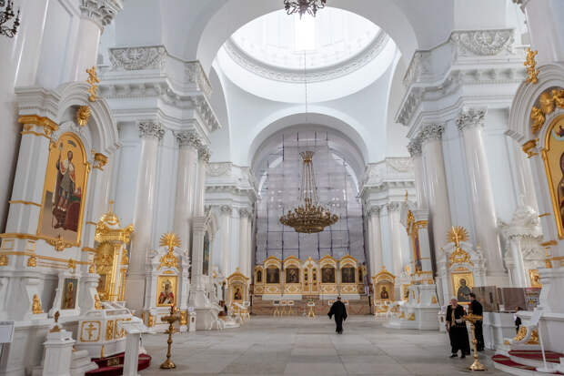 - Когда началась эта работа? - Еще в 2016 году. Конечно, значительное время занял именно поиск в архивах, чтобы восстановление иконостасов было максимально точным. Сейчас правый предел почти готов, в значительной степени и центральный. Левый пока в активном восстановлении. Точных сроков, когда закончится восстановление, пока нет. Все работы ведутся исключительно за счет пожертвований, у нас нет постоянного государственного финансирования, все делается благодаря верующим, которые поддерживают собор.. Специалисты трудятся без остановок, но это не история года-двух, еще многое предстоит вернуть в первозданный вид. - Что уже завершено? - Первое что было сделано в соборе, после его передачи Русской православной церкви, – это реставрация пола из ревельского песчаника. В советские годы он был полностью залит бетоном. Восстановление шло частями, чтобы не прерывать богослужение. Фрагменты оригинального пола бережно собирались, некоторые буквально как мозаика. К сожалению, часть оказалась полностью утрачена, но впоследствии мы выполнили ее из того же самого камня. На сегодняшний день, пол полностью восстановлен. Как и инженерные моменты, по отоплению, водоотводу и так далее. - Что еще? - Выполнены работы по восстановлению отделки стен и сводов, штукатурки, искусственного мрамора. К слову, если присмотреться, мрамор не совсем белый, он исторически немного розоватый, а штукатурка отдает голубоватым оттенком. В итоге получается очень интересное и красивое сочетание цветов. Кроме того, в соборе были и другие, малые архитектурные формы. Например, это Царское место. Изначально, оно было очень красивое и резное. Но в итоге от него до наших дней сохранились только две ступеньки и два мраморных элемента. Стоит отметить, что последние в свое время тоже были вывезены из собора в музей истории Ленинграда в Петропавловскую крепость. В последствии возвращены. Остальное было утрачено. И теперь также находится в проекте по реставрации. Отреставрированы две памятные доски в алтарной части. Первая повествует о том, что собор был заложен императрицей Елизаветой Петровной в 1748 году, а освящен при Николае I в 1835 году. Вторая доска перечисляет целый ряд учебных заведений, над которыми покровительствовал собор. Напомню, что император Николай Первый подписал особое положение о Смольном соборе как о храме всех учебных заведений Российской империи. Также существовала третья мемориальная доска, ныне, увы, утраченная. Она содержала надпись: «Собор возведён в честь памяти императрицы Марии Фёдоровны, покровительницы молодёжи». Вопрос её воссоздания остаётся открытым.
