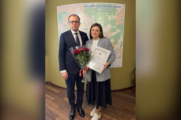 Глава Красногвардейского района Андрей Хорт вручил благодарственное письмо губернатора Санкт-Петербурга Александра Беглова заместителю директора по воспитательной работе школы № 129 Анастасии Афанасьевой за значительный вклад в развитие общего образования и патриотическое воспитание молодежи.